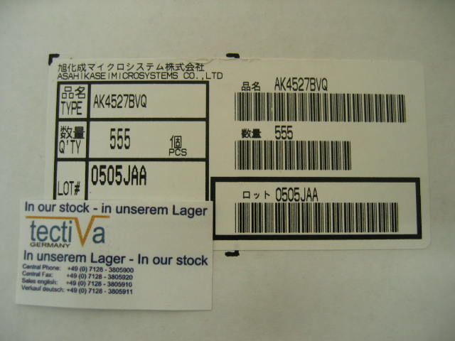 This component AK4527BVQ from manufacturer AKM with date code 05+ can be shipped directly from the Sonnenbuehl warehouse in Germany. Make an RFQ today - we are looking forward to offer you the component AK4527BVQ. Tectiva Germany is your partner for excess inventory, allocation parts EOL parts and special procurement of electronic components. Let's do it! Click here to request the AK4527BVQ. |