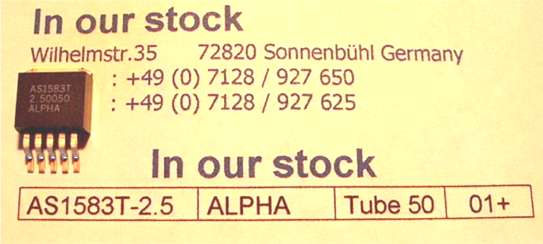 This component AS1583T-2.5 from manufacturer ALPHA with date code 01+ can be shipped directly from the Sonnenbuehl warehouse in Germany. Make an RFQ today - we are looking forward to offer you the component AS1583T-2.5. Tectiva Germany is your partner for excess inventory, allocation parts EOL parts and special procurement of electronic components. Let's do it! Click here to request the AS1583T-2.5. |
