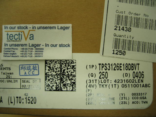 This component TPS3126E18DBVT from manufacturer TI with date code 04+ can be shipped directly from the Sonnenbuehl warehouse in Germany. Make an RFQ today - we are looking forward to offer you the component TPS3126E18DBVT. Tectiva Germany is your partner for excess inventory, allocation parts EOL parts and special procurement of electronic components. Let's do it! Click here to request the TPS3126E18DBVT. |