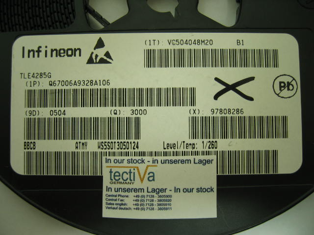 Das Bauteil TLE4285G ist ein original Hersteller Teil. Das Bauelemet TLE4285G ist neu und unbenutzt. Die RoHS und VPE Eigenschaften des TLE4285G sind REEL RoHS. |