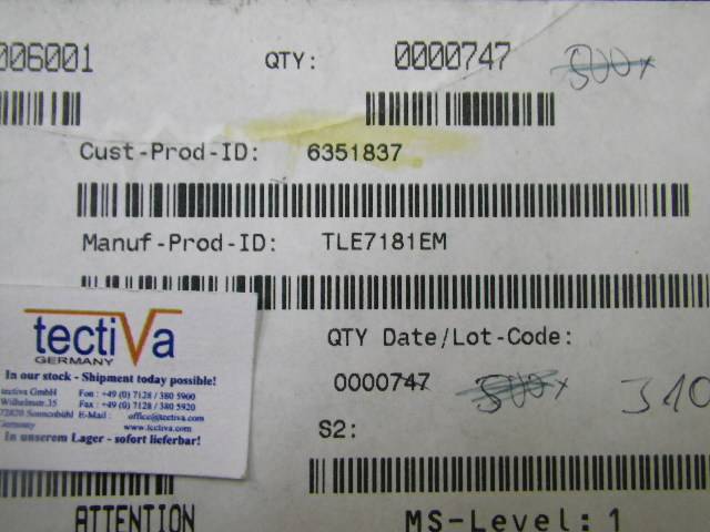 Das Bauteil TLE7181EM ist ein original Hersteller Teil. Das Bauelemet TLE7181EM ist neu und unbenutzt. Die RoHS und VPE Eigenschaften des TLE7181EM sind Tube 50 SMD. |